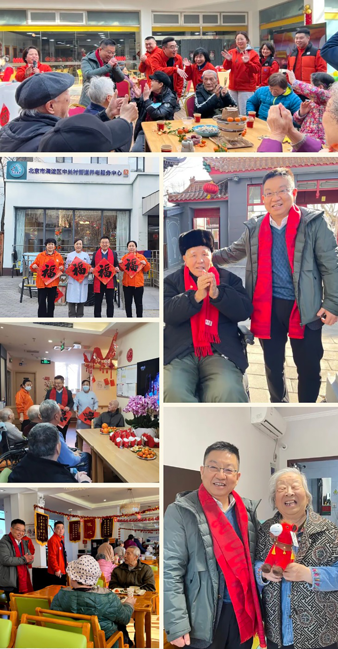 李斌副总裁先后前往中关村街道养老服务中心、泰和睿园、纳兰园老年公寓等项目,看望入住长者,向百岁老人及高龄长辈送上新春问候,与长者围炉话新春,叮嘱团队悉心照料,让长者在团圆喜庆的氛围中安享幸福晚年。
