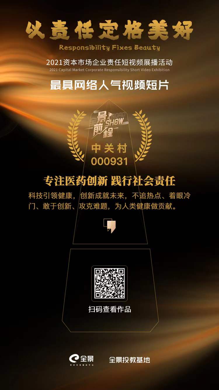 继去年首届“景show前程”企业文化短视频展播成功举办后,2021年11月起,由全景网主办的2021年度资本市场企业责任短视频公益展播活动再度火热启动。经过两周的网络展播,中关村(000931)选送的短视频《专注医药创新 践行社会责任》脱颖而出,以108956票成为本次活动最具网络人气短视频。